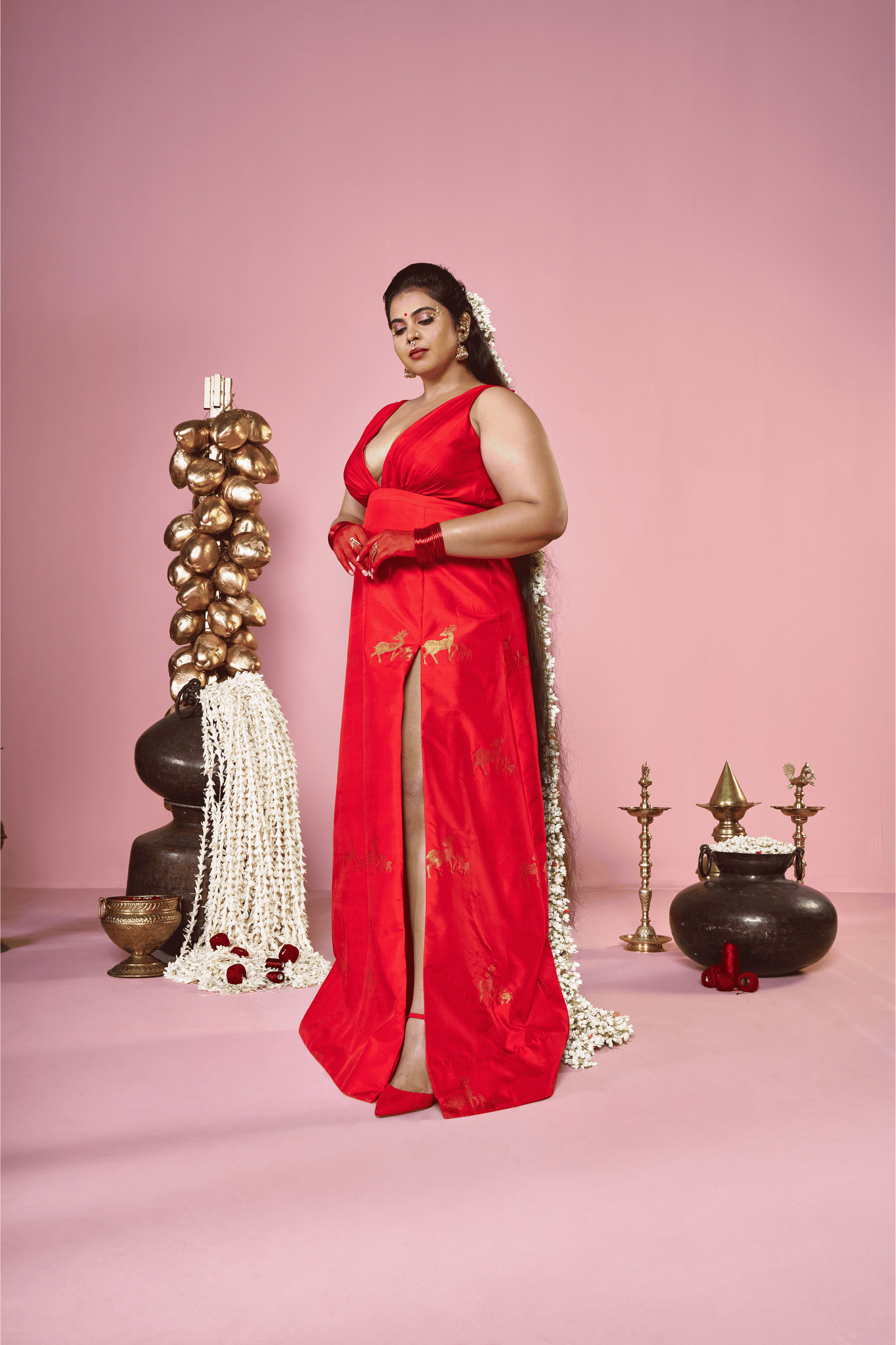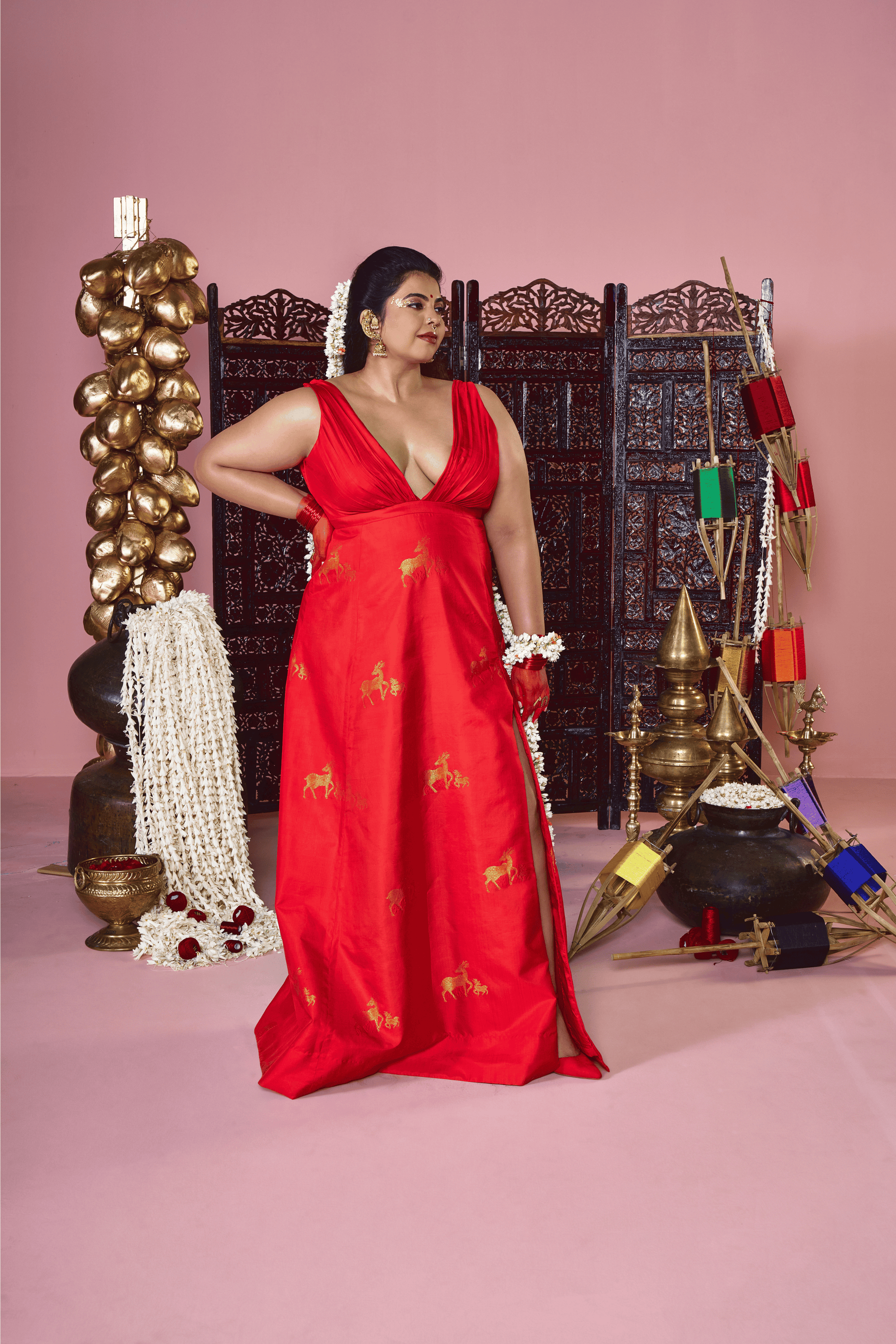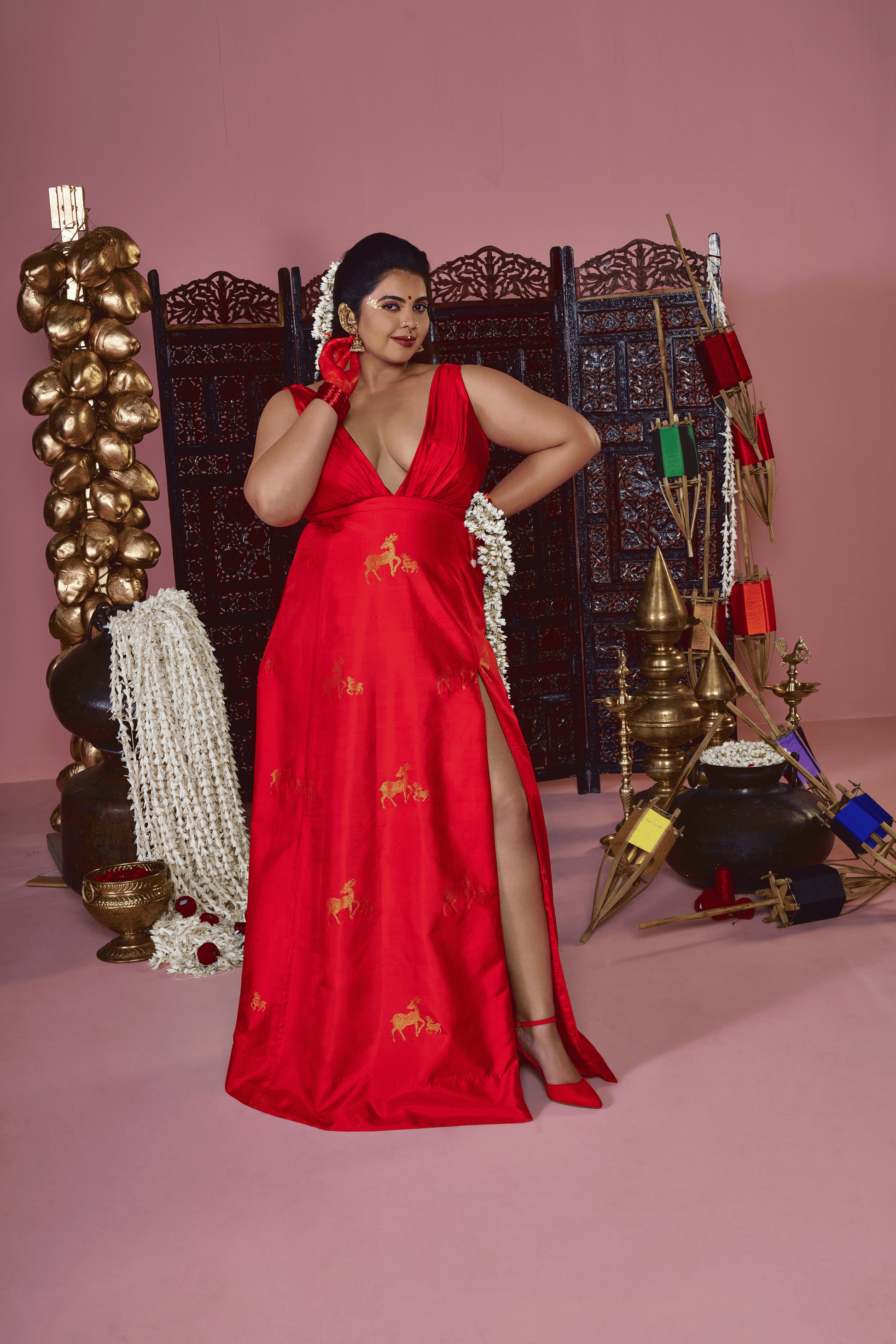 Named after Kamakhya, the goddess of the bleeding earth and creative power, this dress is a symbol of fertility, mysticism, and the nurturing force of nature. The vibrant red hue represents the life-blood of the universe, while the fabric features an enchanting motif of mother and baby deer running through its length. These figures symbolize the gentle yet resilient bond of creation, depicting a state of grace and constant renewal.