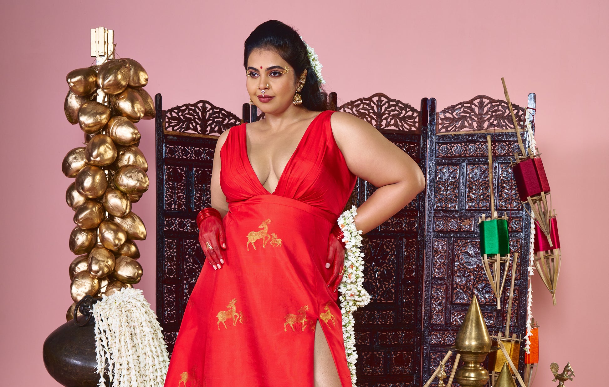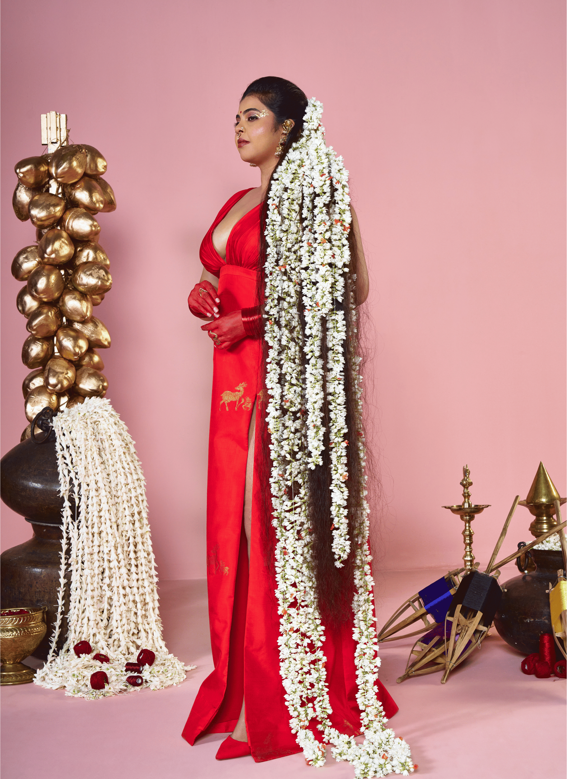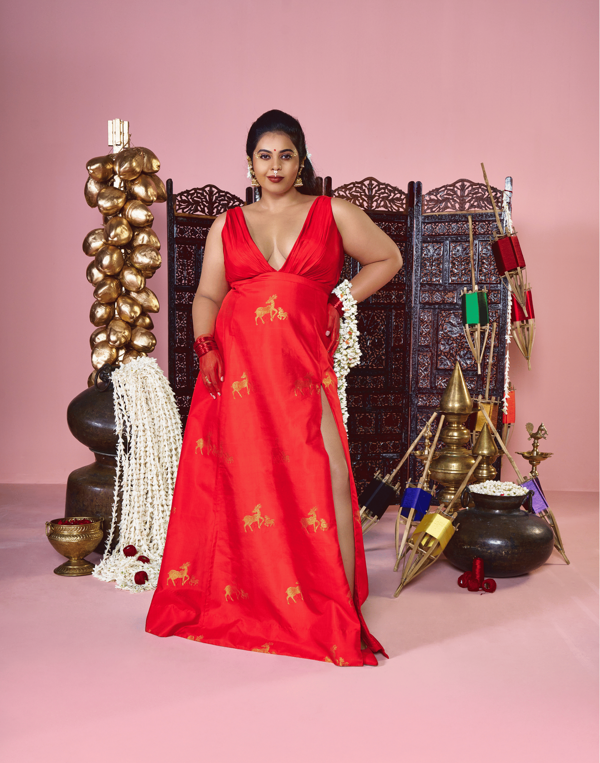 Named after Kamakhya, the goddess of the bleeding earth and creative power, this dress is a symbol of fertility, mysticism, and the nurturing force of nature. The vibrant red hue represents the life-blood of the universe, while the fabric features an enchanting motif of mother and baby deer running through its length. These figures symbolize the gentle yet resilient bond of creation, depicting a state of grace and constant renewal.
